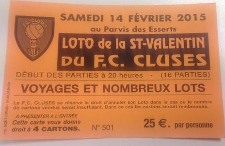 Les cartes pour le loto de la St Valentin qui aura lieu le samedi 14/02 aux Esserts sont disponibles à la vente à l'office de tourisme de Cluses et au bureau de tabac des lacs à Thyez. Le club organise des permanences tous les soirs au siège du club egalement à partir de 19h.