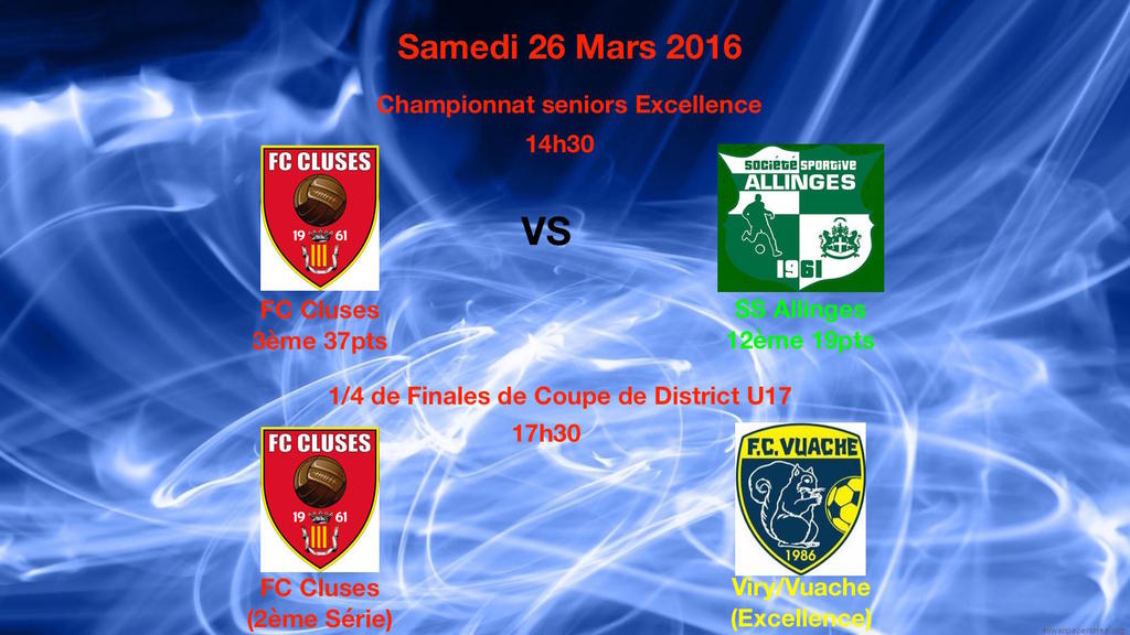 -Les U17, auteur d'un bon début de championnat, accueillent Viry/Vuache pour une place en 1/2 finale de Coupe de District à 17h, juste après l'équipe 1. Il faudra réaliser un exploit contre une équipe évoluant 2 niveaux au dessus, mais nos jeunes nous ont déjà prouvé par le passé que la coupe réserve souvent des surprises.