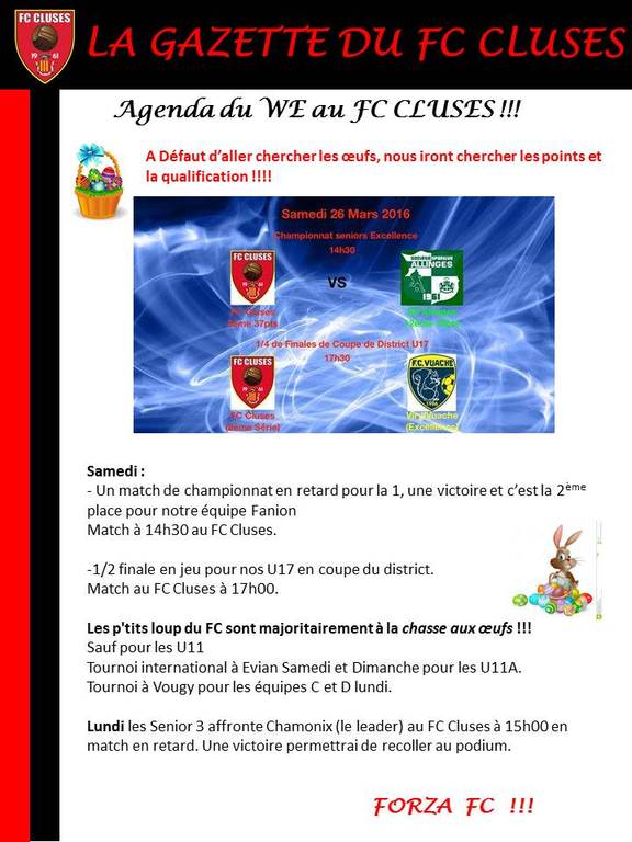 La Gazette du FC CLUSES AGENDA du WE de Paques 2016