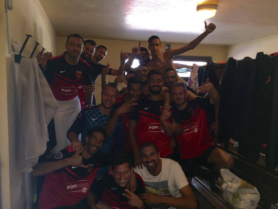 -Enfin, l'équipe fanion (photo) se déplaçait à Allinges, terrain ou peu d'équipes viennent s'imposer. Débutant tambour battant, se créant même 3 occasions franches, nos joueurs, sur une perte de balle au milieu de terrain, encaissèrent un but à la 38ème minute de jeu. Mi temps 1-0. Regonflés à bloc durant la mi temps, les rouges et noirs ont pris le jeu à leur compte et c'est sur coup franc que Murat égalisait à la 70ème minute. L'équipe aurait pu se contenter d'un match nul, mais c'était sans compter sur un centre millimétré de Mehdi au deuxième poteau que Aymin plaçait sa tete et délivrait notre équipe à la 85ème. Sans avoir été réellement mis en danger, mais dans un match engagé sur un petit terrain, les joueurs à Mefter et Nano ont remporté une belle victoire au forceps, qui va faire du bien au moral après leur défaite en Coupe de France.