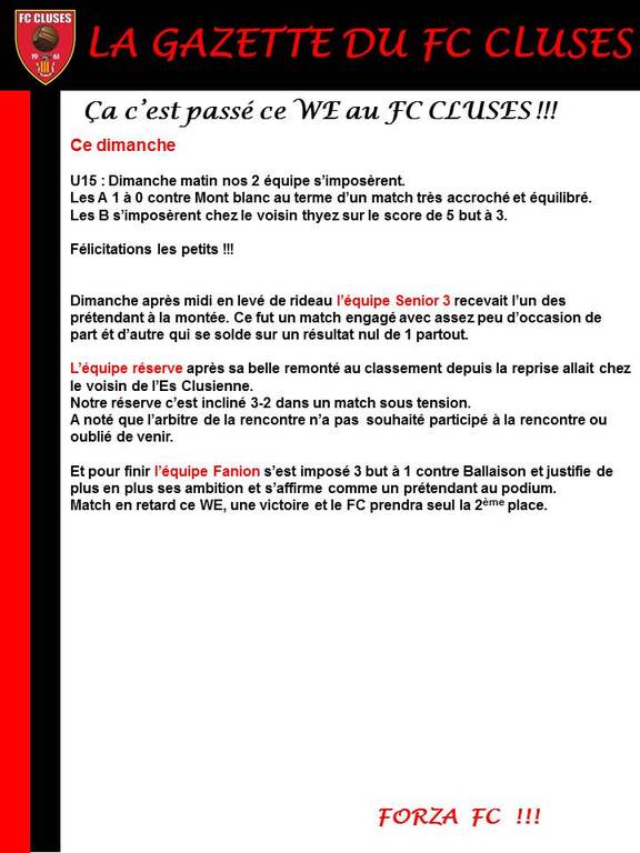La Gazette du FC CLUSES 19 et 20 Mars 2016