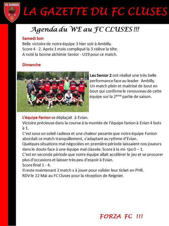 La Gazette du FC CLUSES AGENDA WE du 14 et 15 Mai 2016