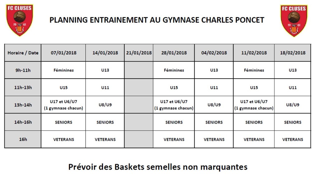 Planning des entrainements en salle le dimanche au gymnase Charles Poncet à Cluses