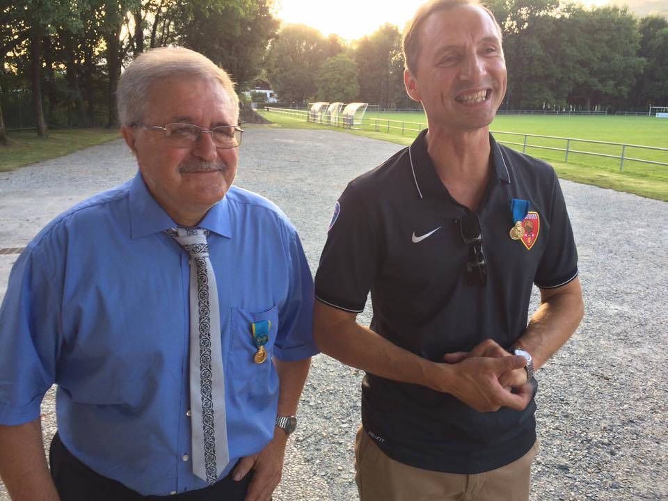 Fabien Pellier (co-président du FC Cluses (à droite)) a reçu la médaille de bronze Jeunesse & Sport remise par Carmelo Borutto .