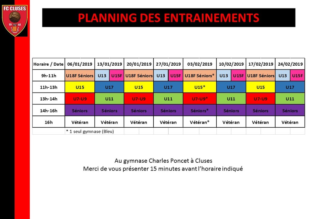 FC CLUSES PLANNING ENTRAINEMENT AU GYMNASE JANVIER et FEVRIER